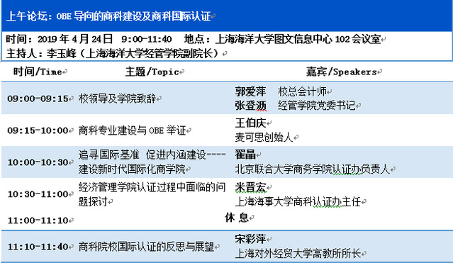 “新时代高教40条”中指出,要坚持学生中心,全面发展;坚持服务需求,成效导向;坚持完善机制,持续改进。基于OBE理念,参照国际商科认证标准进行商科建设和教学改革,已是多所高校的工作方向,如何通过数据对其过程持续监测,如何用数据对达成情况进行举证,是当前高校商科建设的重要内容。上海高校的商科院校建设及商科国际认证专题研讨会将于2019年4月24日上午在必赢76net线路唯一官方网站经管学院举行,本次专题研讨会主题是“OBE导向的商科建设及商科国际认证”,诚邀您莅临指导交流,具体事宜安排如下:
