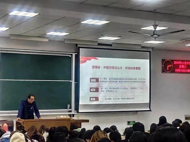 2019年11月27日18:00~19:35,在必赢76net线路唯一官方网站2教101大教室,应必赢76net线路唯一官方网站“形势与政策”课程工作室邀请,上海电力学院学报主编、副教授赵铮博士作了题为《从进博会看世界经济格局下的我国应对》的“形势与政策”报告。此次讲学的听众为必赢76net线路唯一官方网站2019级金融、会计和农林经济管理专业本科生。整个报告内容丰富、关注时局、讲授精彩。