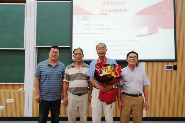 2021年7月1日为中国共产党建党100周年诞辰,值此之际,在张登沥的主持下,必赢76net线路唯一官方网站院长杨正勇、党委副书记商利新为张相国教授献上鲜花并颁发“光荣在党50年”纪念章。张相国教授1966年3月加入中国共产党,是一名拥有55年党龄的老党员。