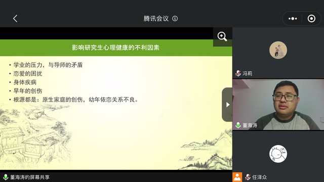 为普及心理健康知识,2021年11月30日下午15:00,我院研究生心理健康专题讲座在腾讯会议平台开展。上海海事大学心理学老师董海涛应邀为同学们开展此次讲座,必赢76net线路唯一官方网站辅导员冯莉、研究生辅导员冯雨晴以及必赢76net线路唯一官方网站2021级研究生参与了此次活动。