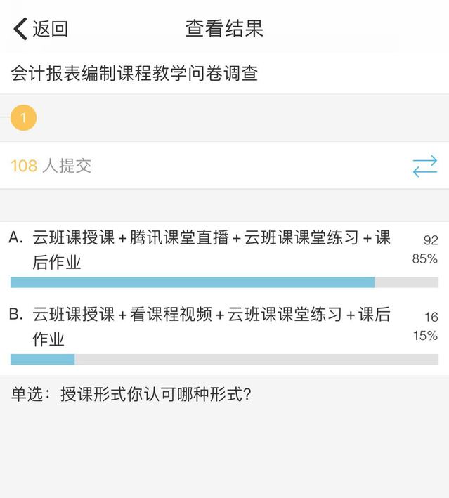 谭春兰表示,组织教学要做好充分准备,课前通知学生,课中吸引学生,课后督促学生,同时听取学生对教学的建议,进行调整完善。在教学过程中,谭春兰反复探索,不断反思复盘,如何让学生有比较好的学习体验。针对有学生反映看视频沉闷,犯困的不足,谭春兰在云班课平台对《会计报表编制》课程进行了问卷调查,探索学生能够接受的授课模式。85%学生表示接受“云班课+腾讯课堂直播+云班课课堂练习+课后作业”这一模式。“为什么应收账款要根据应收账款和预收账款明细账户期末余额来填制”,在讲到应收账项目填制这个重要知识点的时候,通过与同学们的互动回答,谭春兰能够了解学生的学习情况,同时检查学生在线情况等。